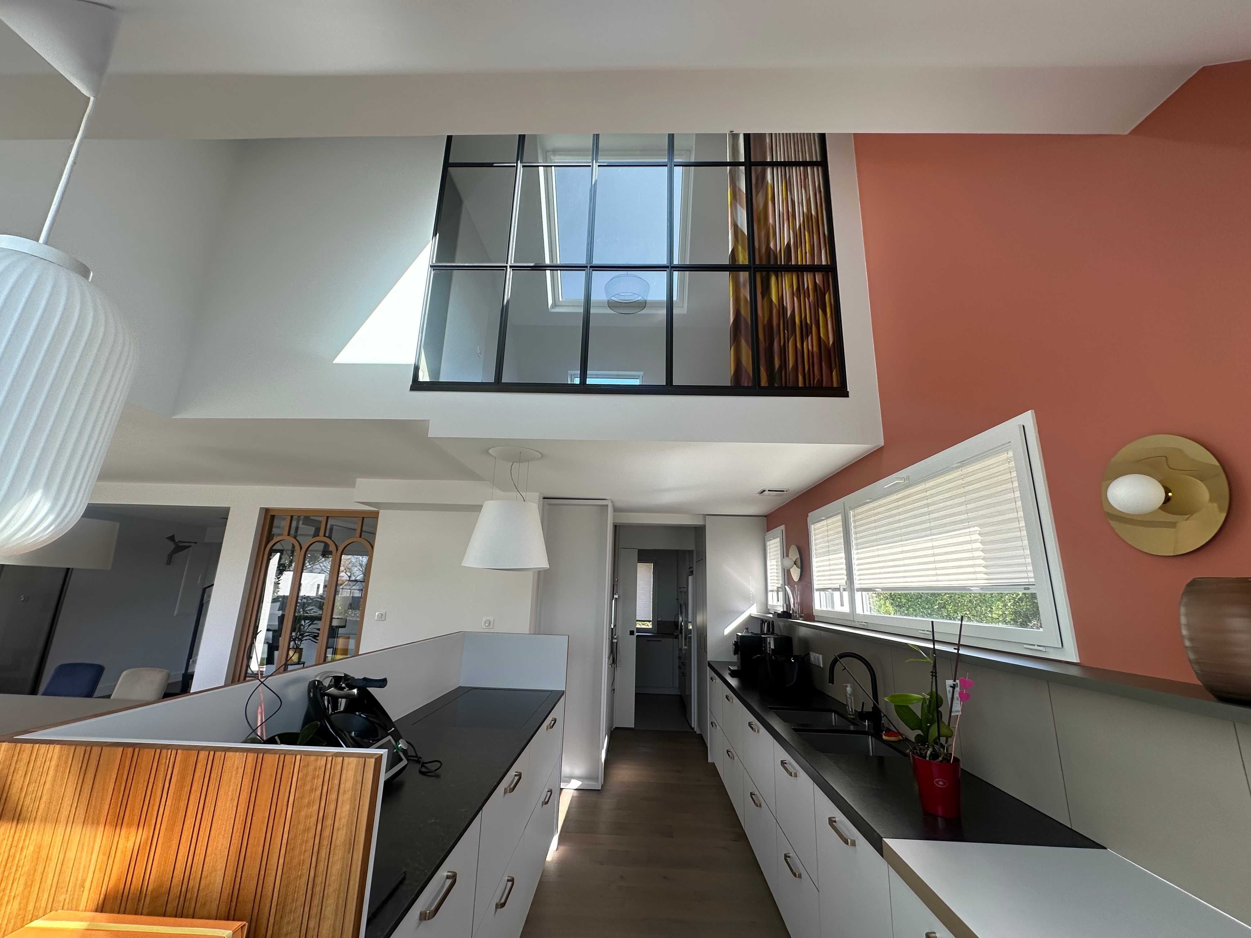 La cuisine américaine aménagée et équipée s'ouvre sur la salle-à-manger lumineuse exposée sud-ouest, agrémentée d'un poêle à bois pour une ambiance chaleureuse. Le salon également très lumineux grâce à ses nombreuses baies vitrées propose un espace de détente agréable et cocooning.