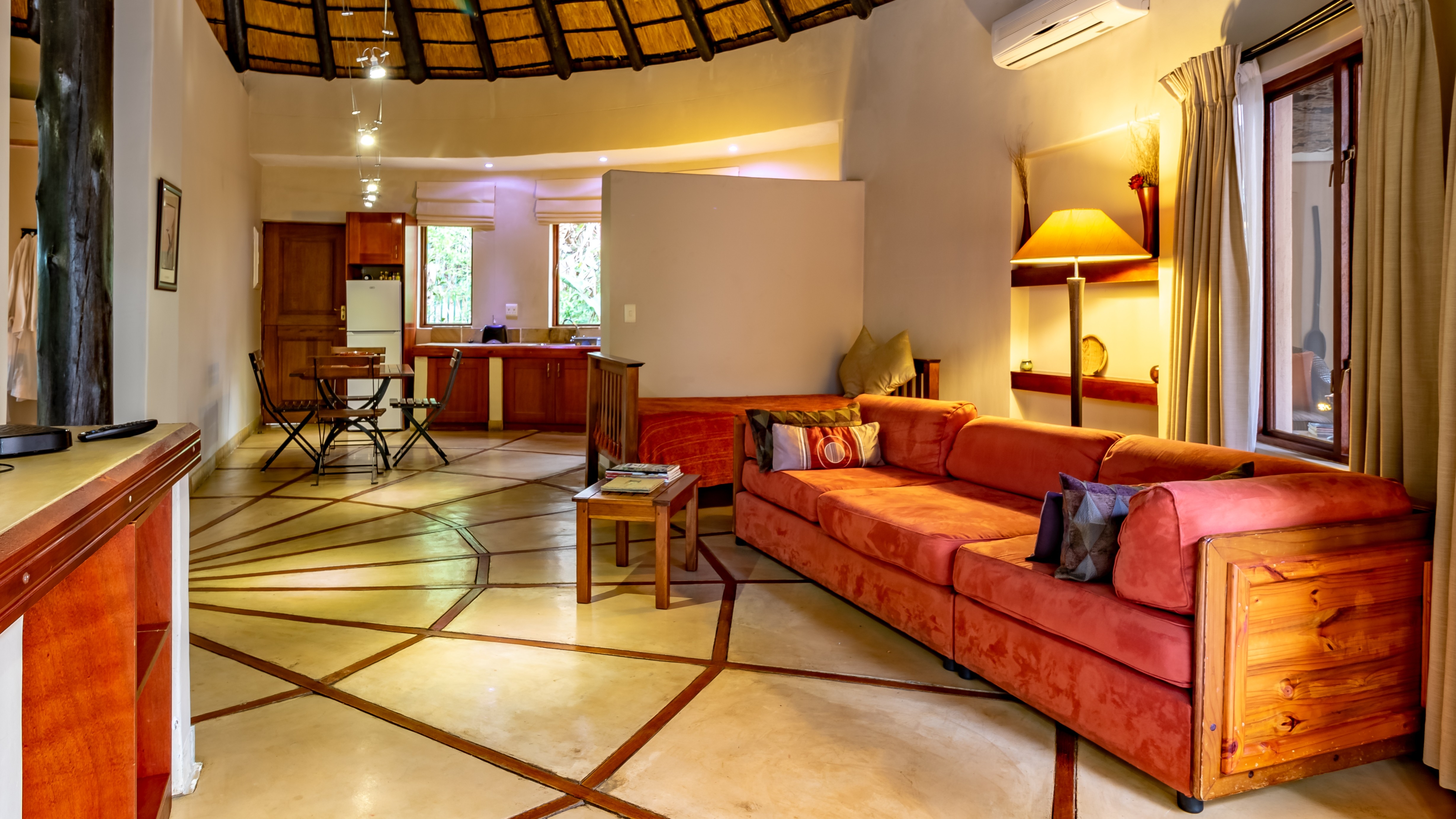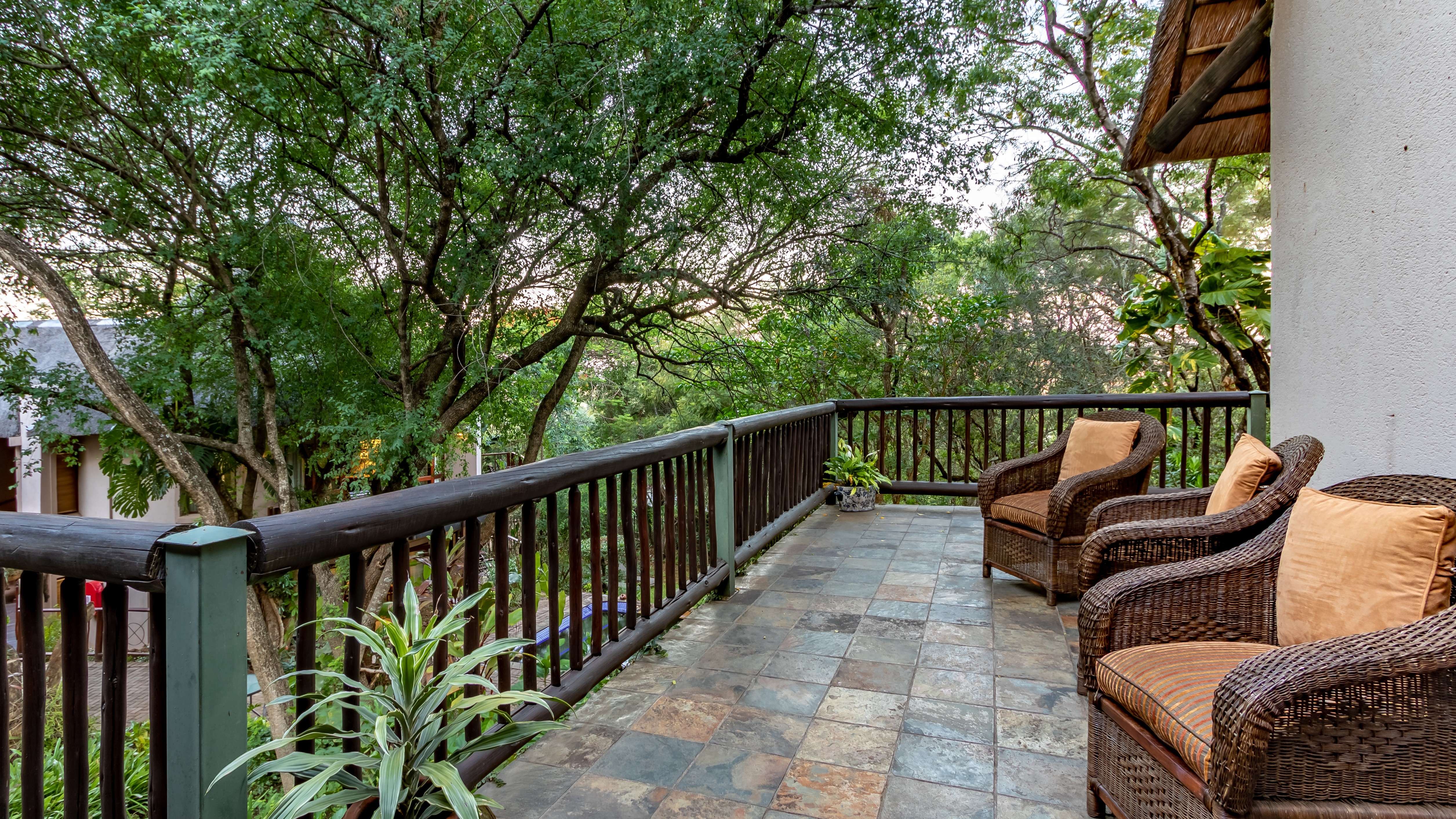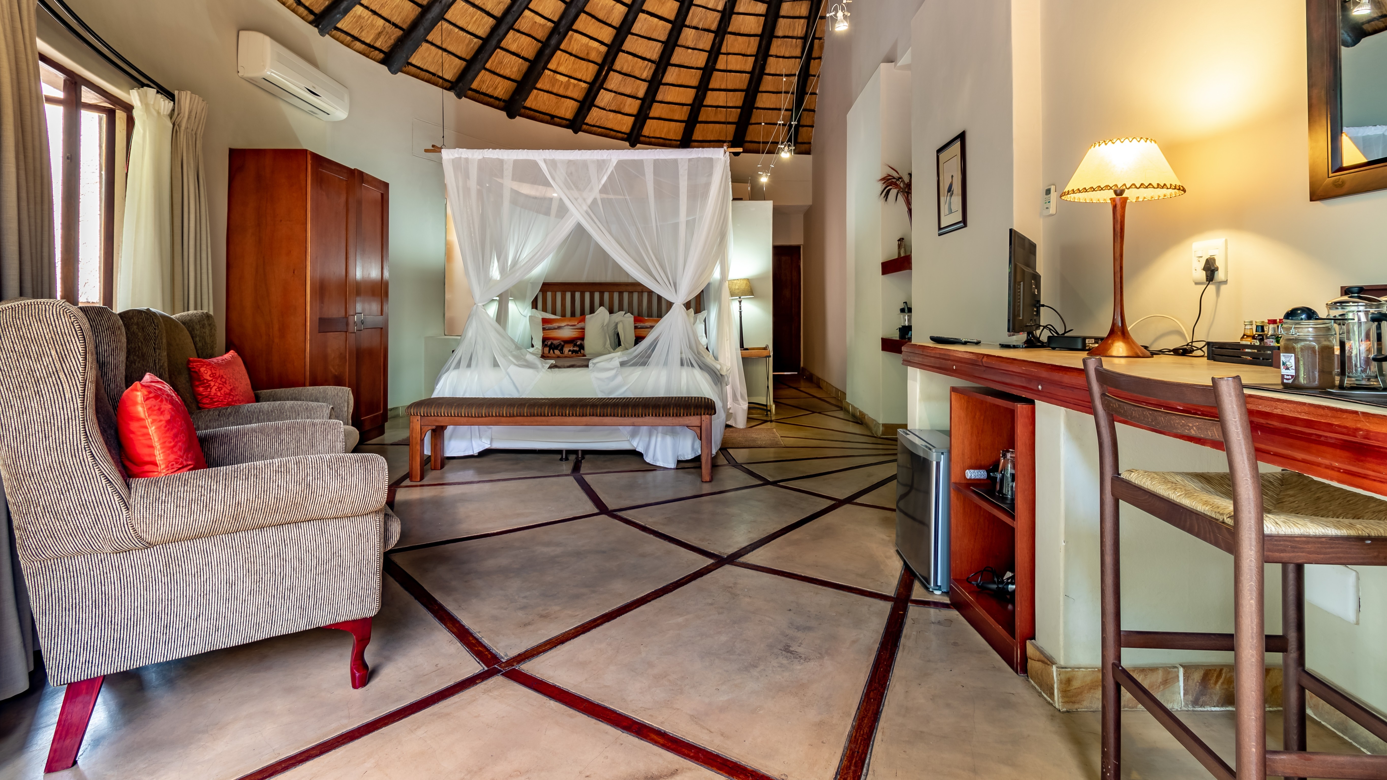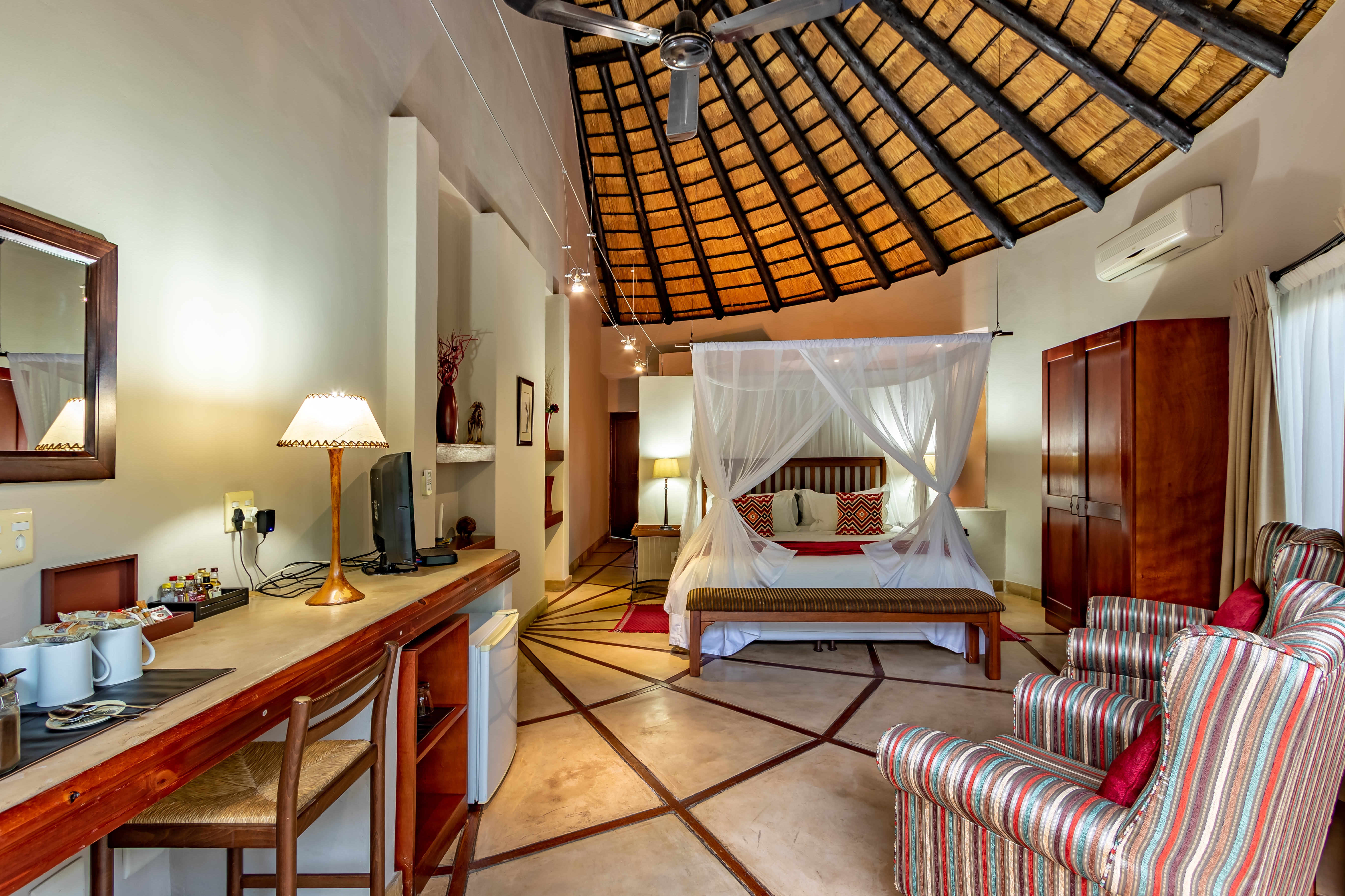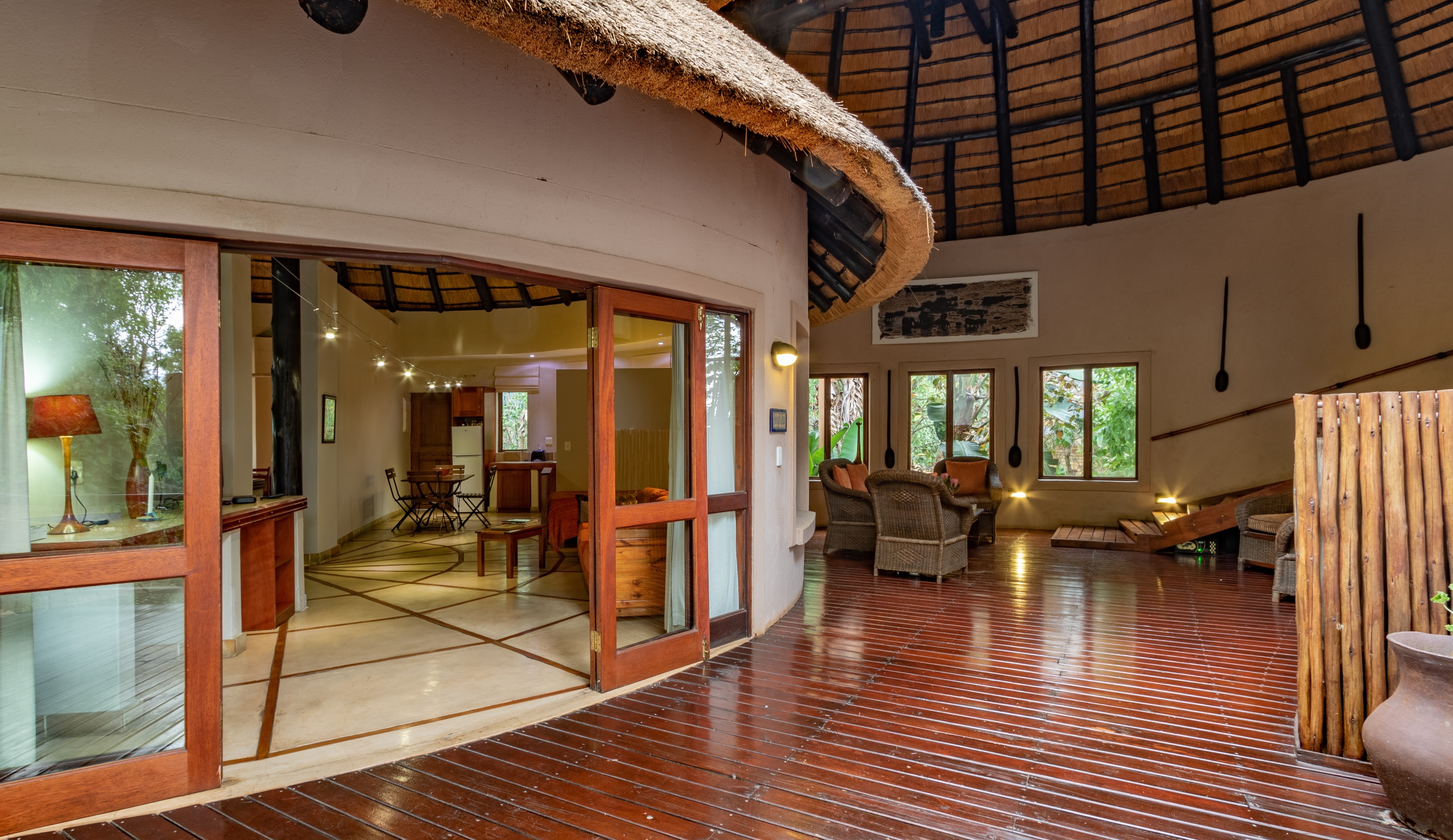 The lodge features four spacious luxury king suites, each designed with refined finishes, private entrances, air-conditioning, and serene garden views. In addition, the property includes a beautifully appointed self-catering thatched lodge of approximately 110m², offering a generous master suite, oversized bathroom, open-plan living area, fully equipped kitchen, and elegant dining space.