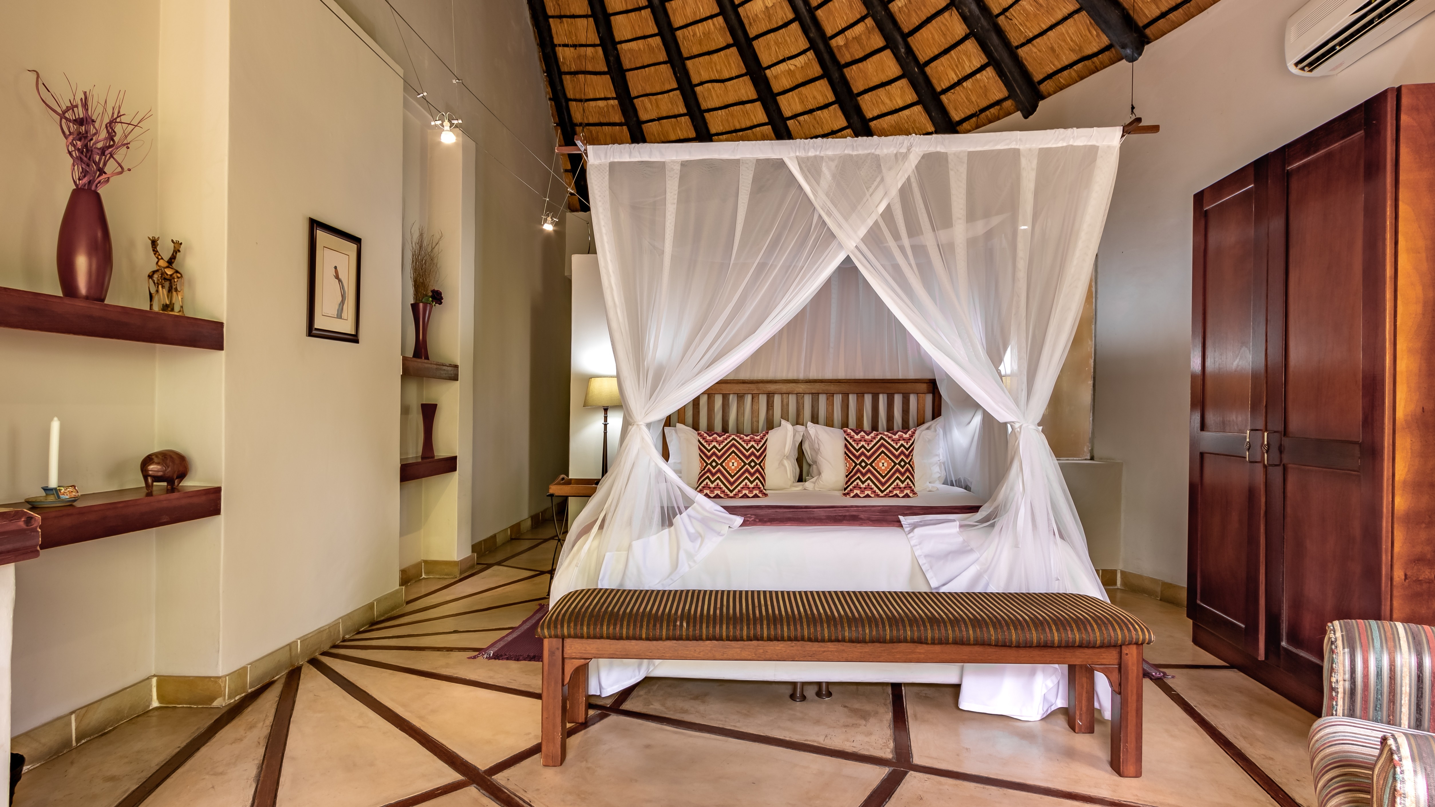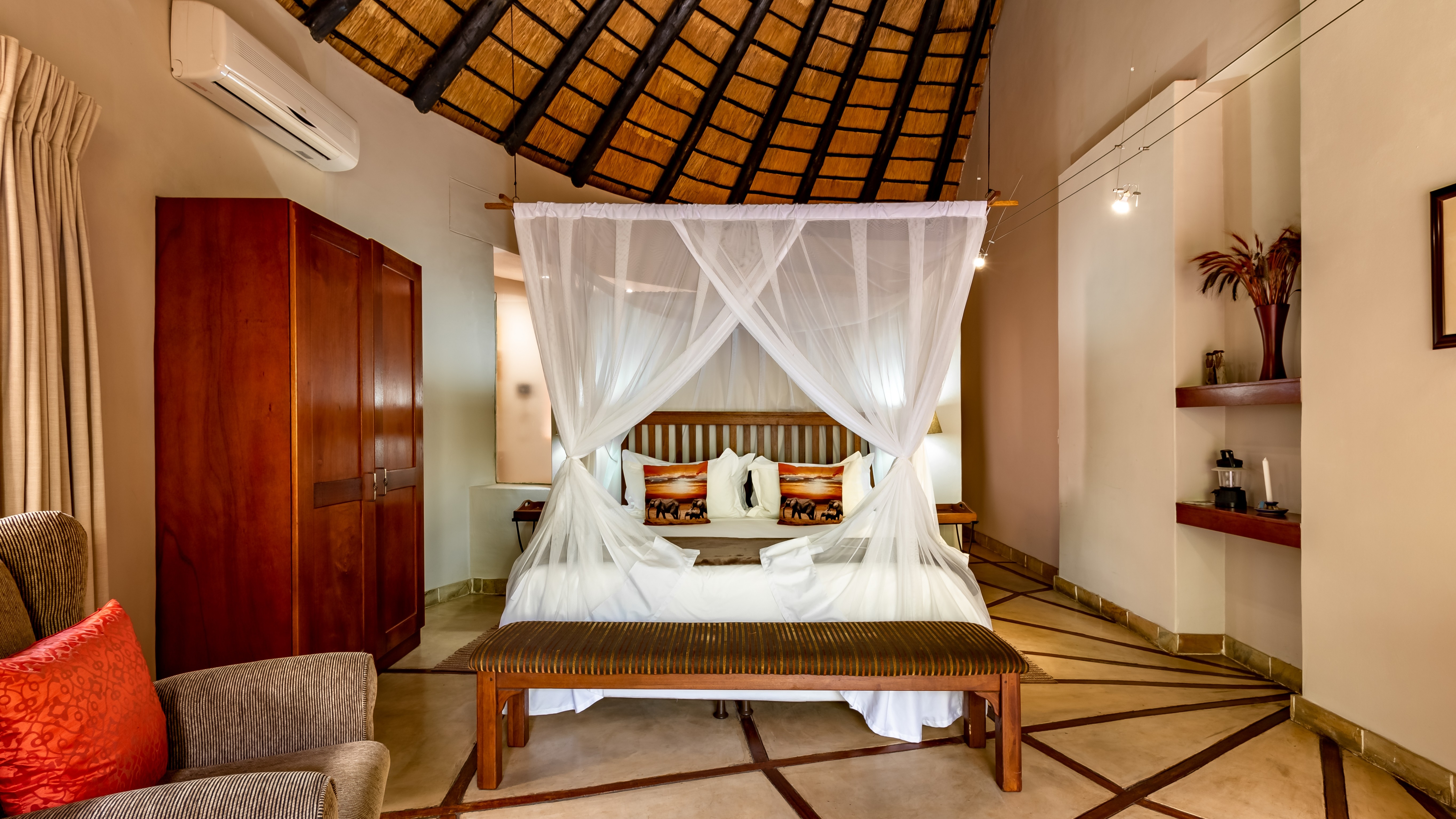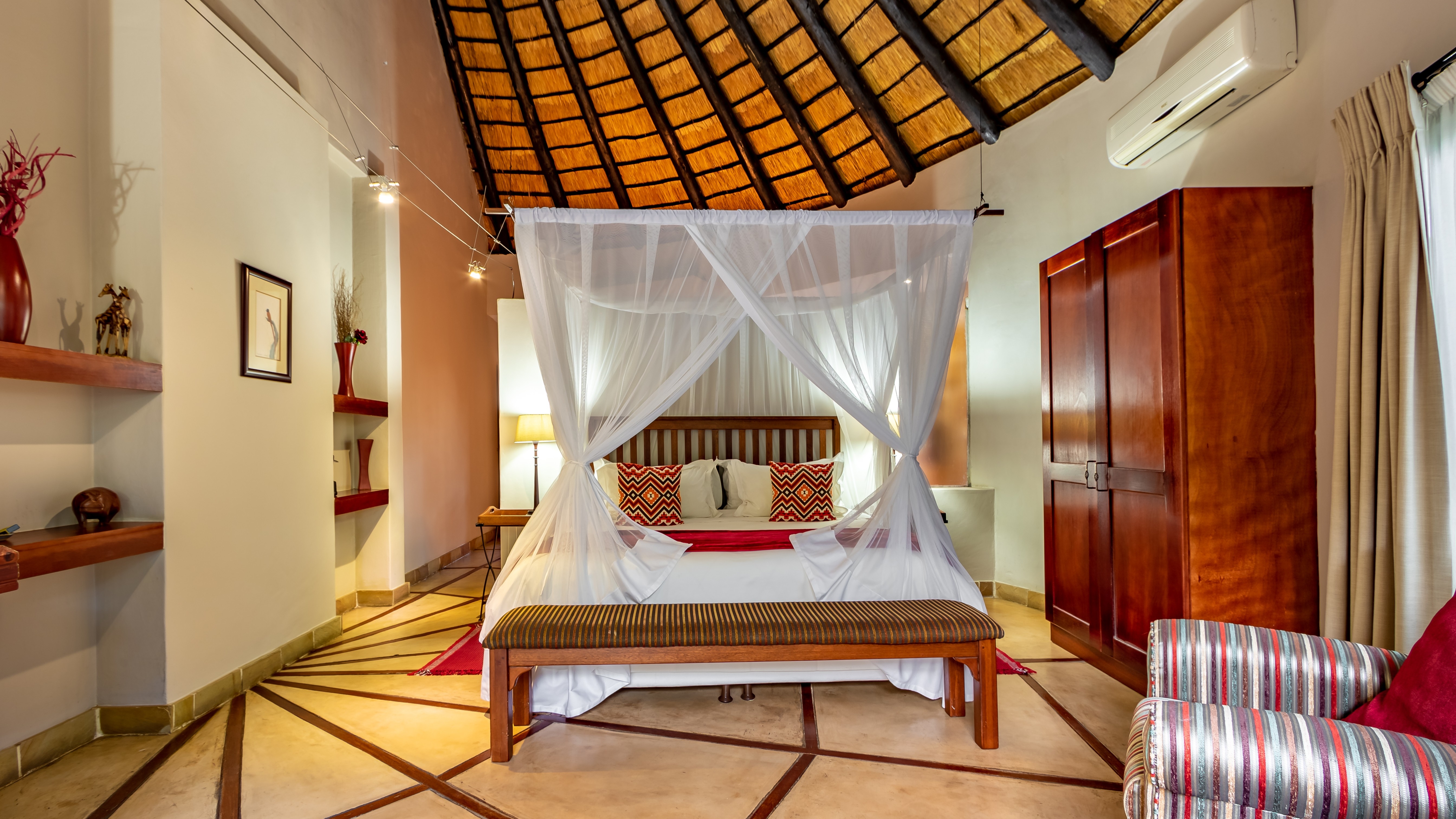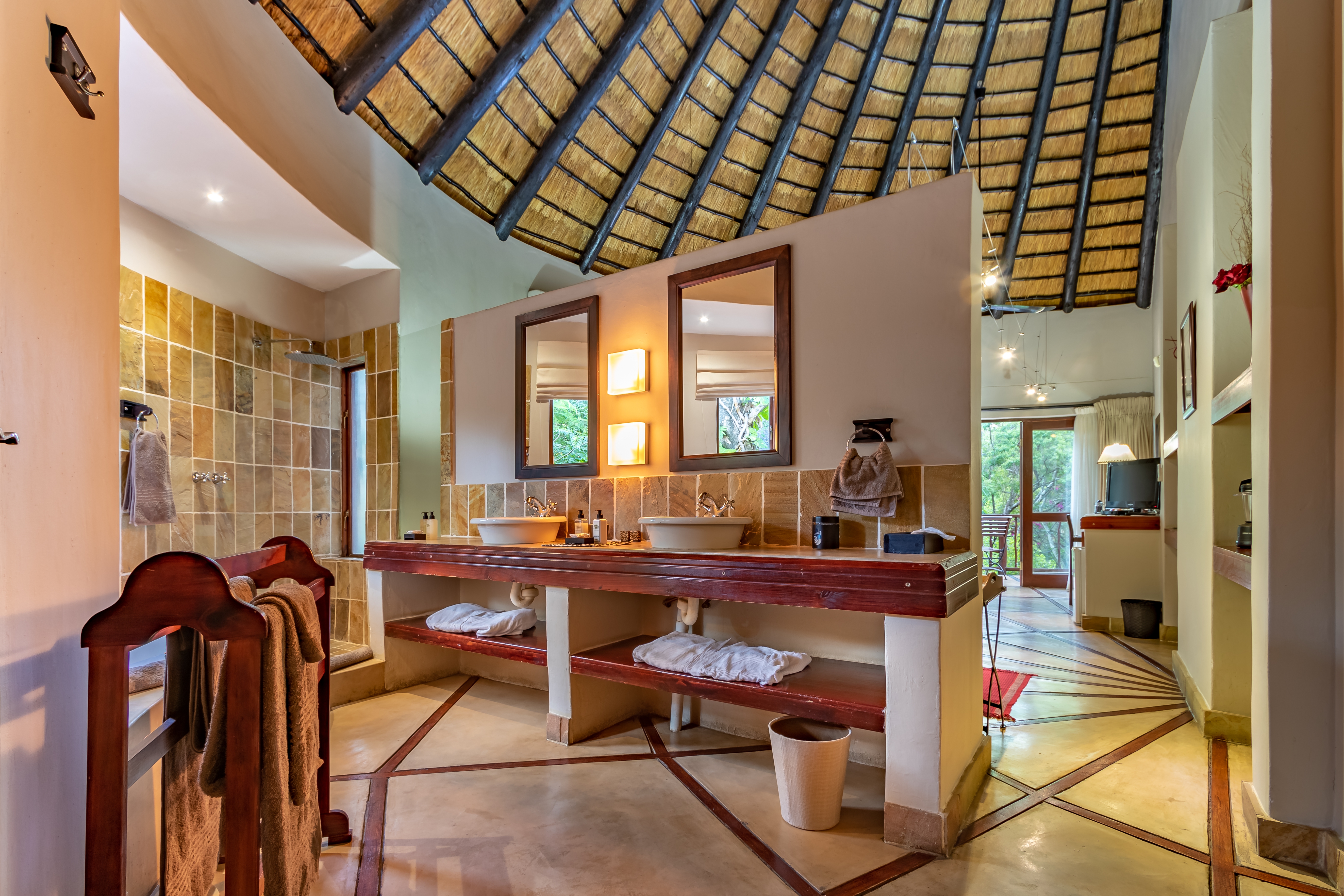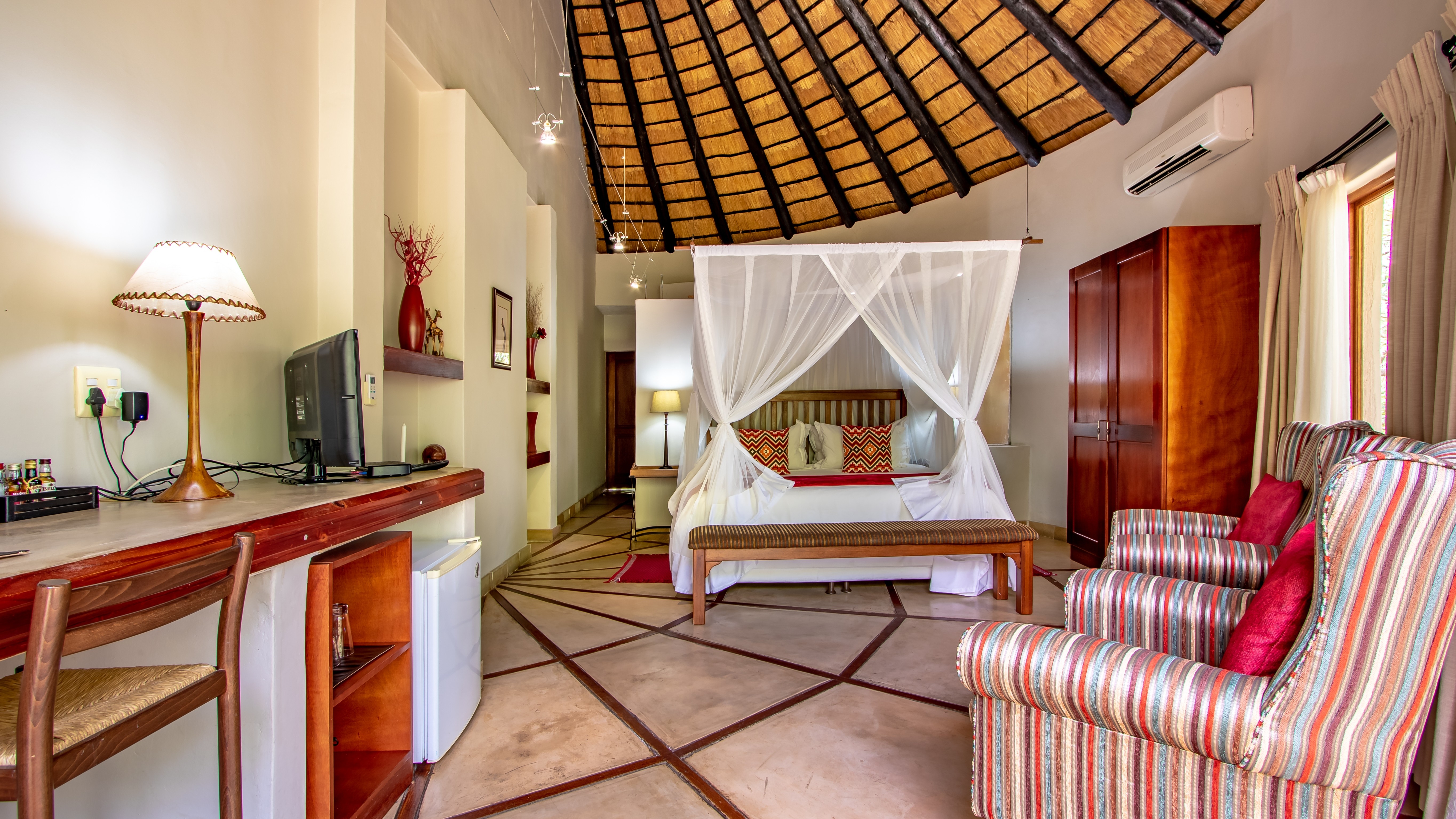 The lodge features four spacious luxury king suites, each designed with refined finishes, private entrances, air-conditioning, and serene garden views. In addition, the property includes a beautifully appointed self-catering thatched lodge of approximately 110m², offering a generous master suite, oversized bathroom, open-plan living area, fully equipped kitchen, and elegant dining space.
