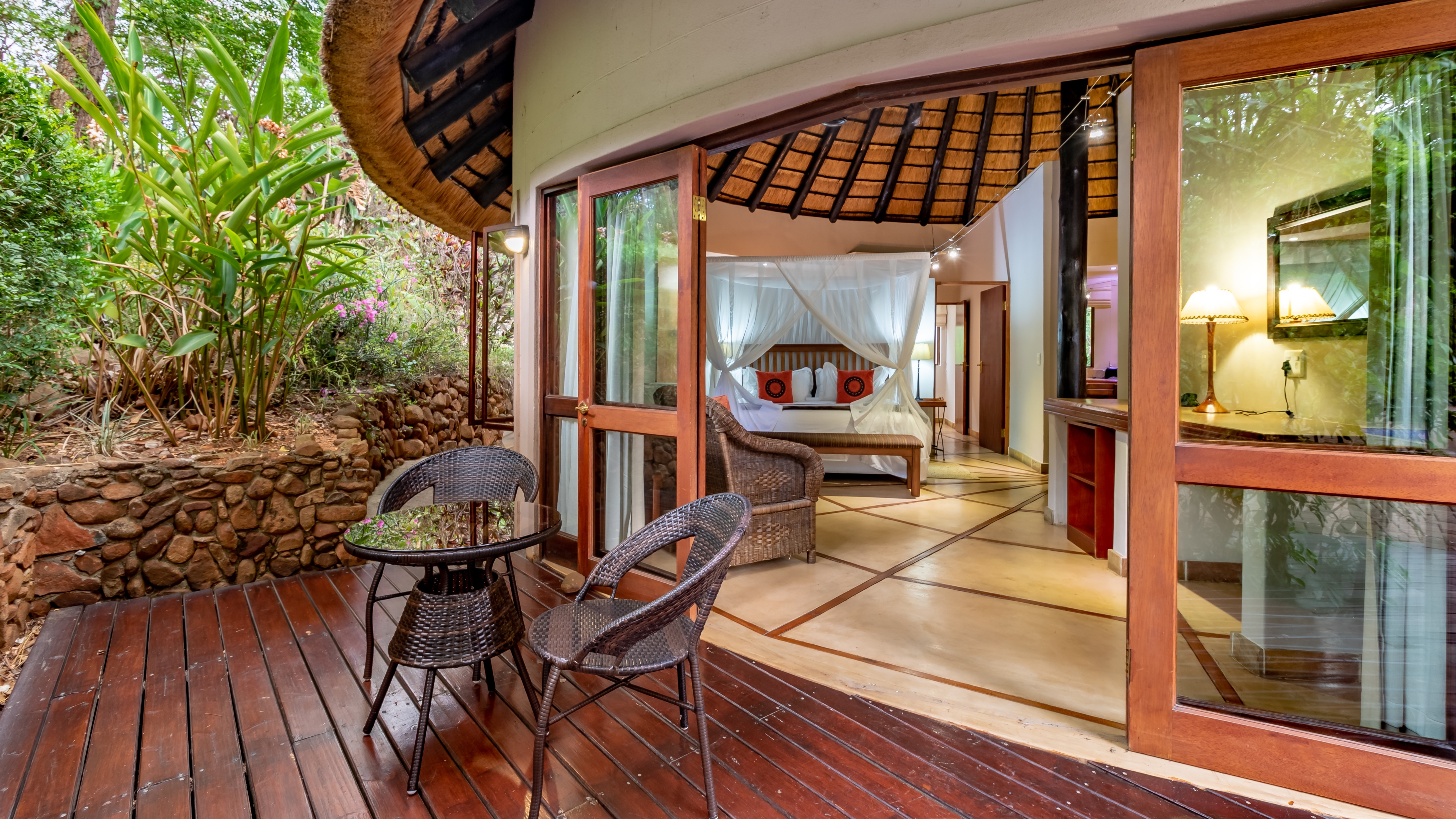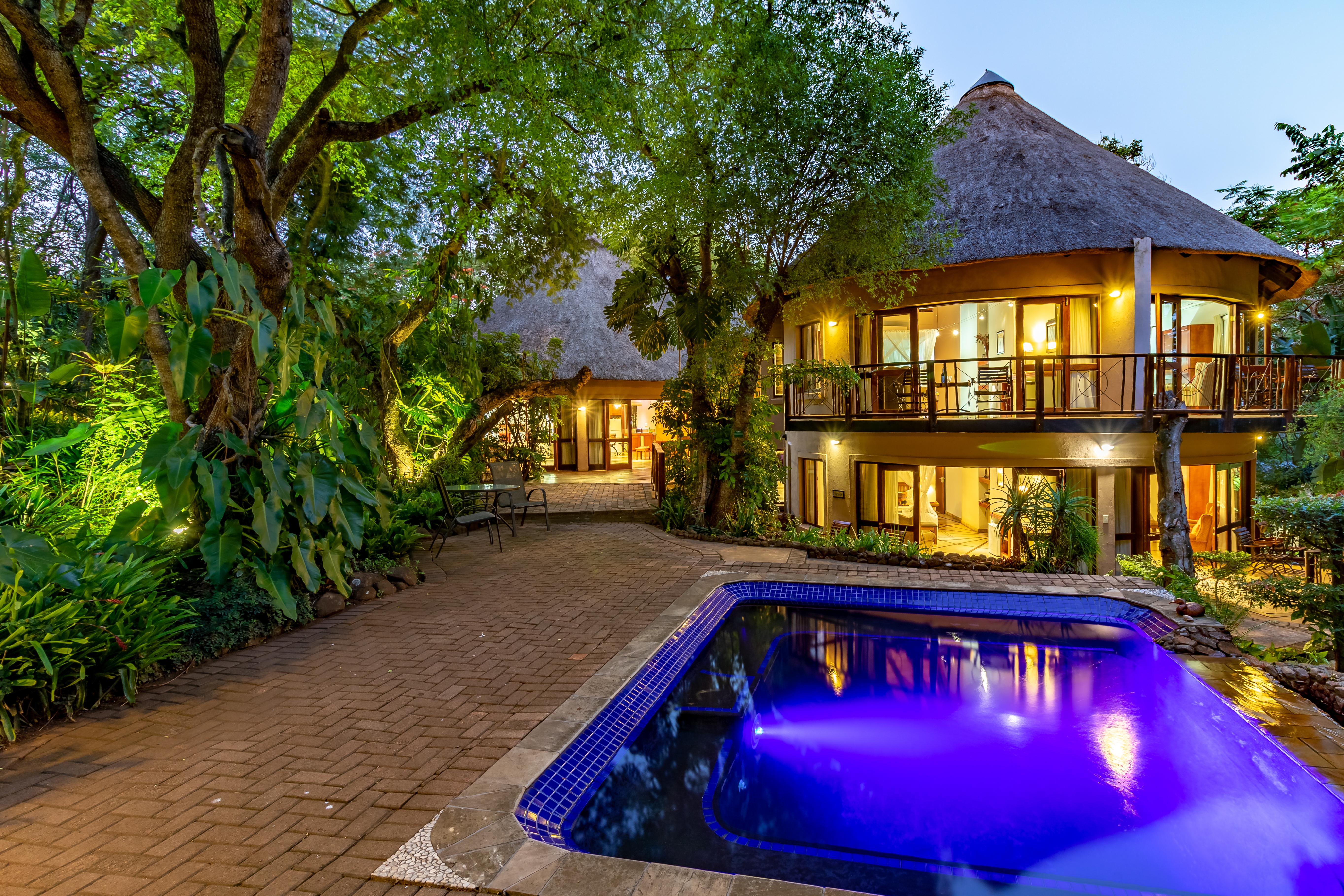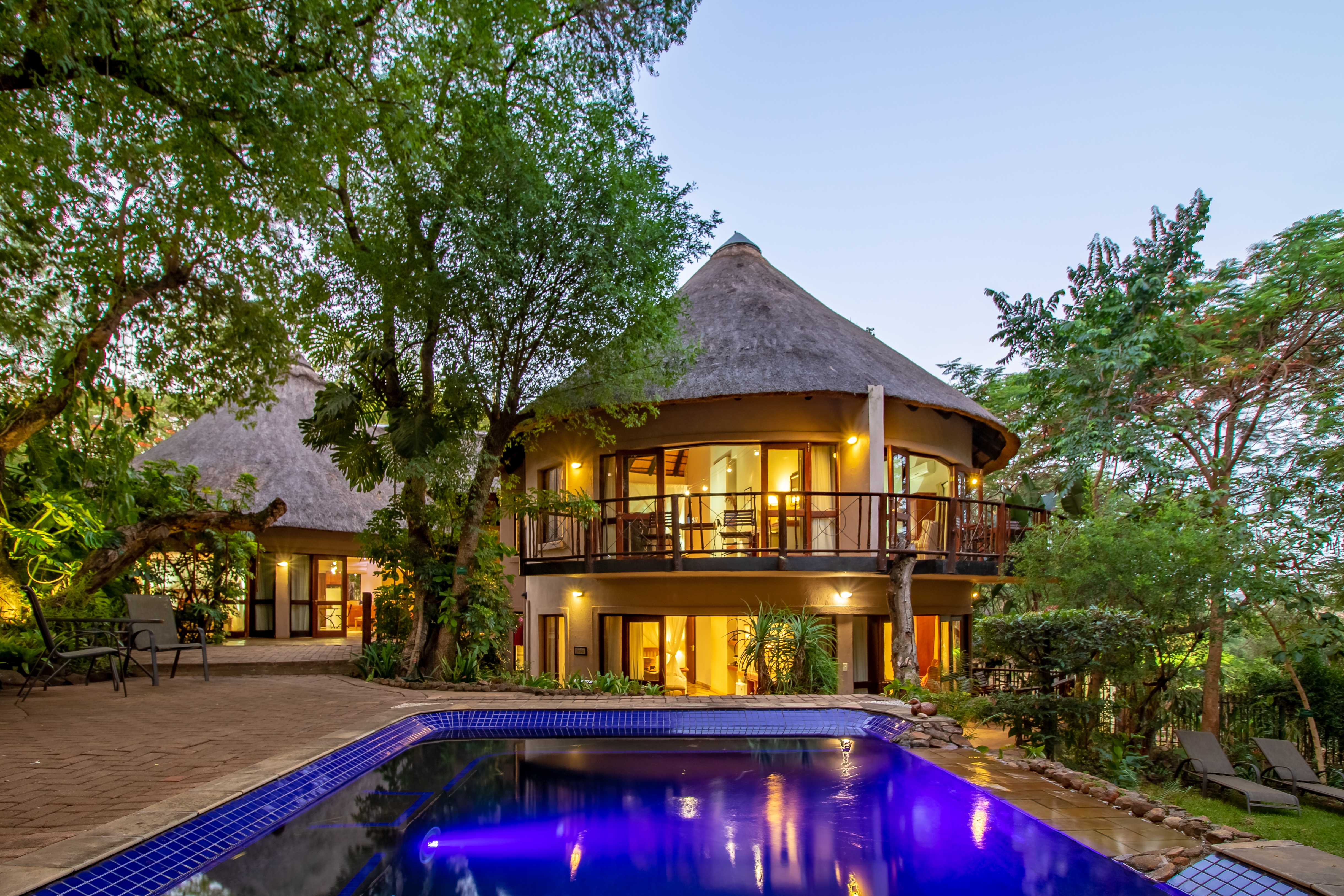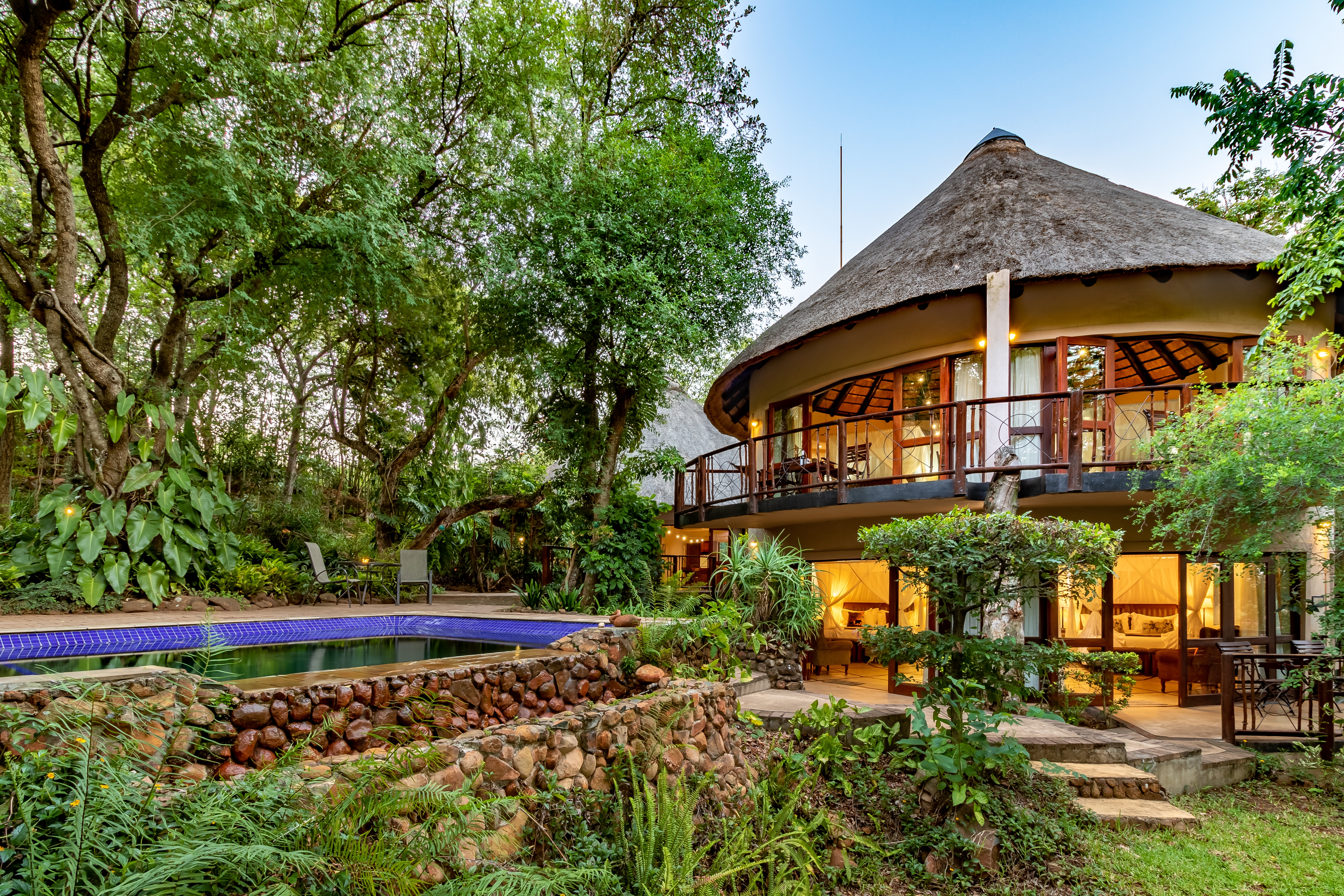 The outdoor areas are designed for relaxation and privacy, featuring beautifully landscaped subtropical gardens, abundant birdlife, and a sparkling pool—an idyllic retreat after a day of safari or sightseeing. The lodge’s prime location provides effortless access to major regional highlights, including: