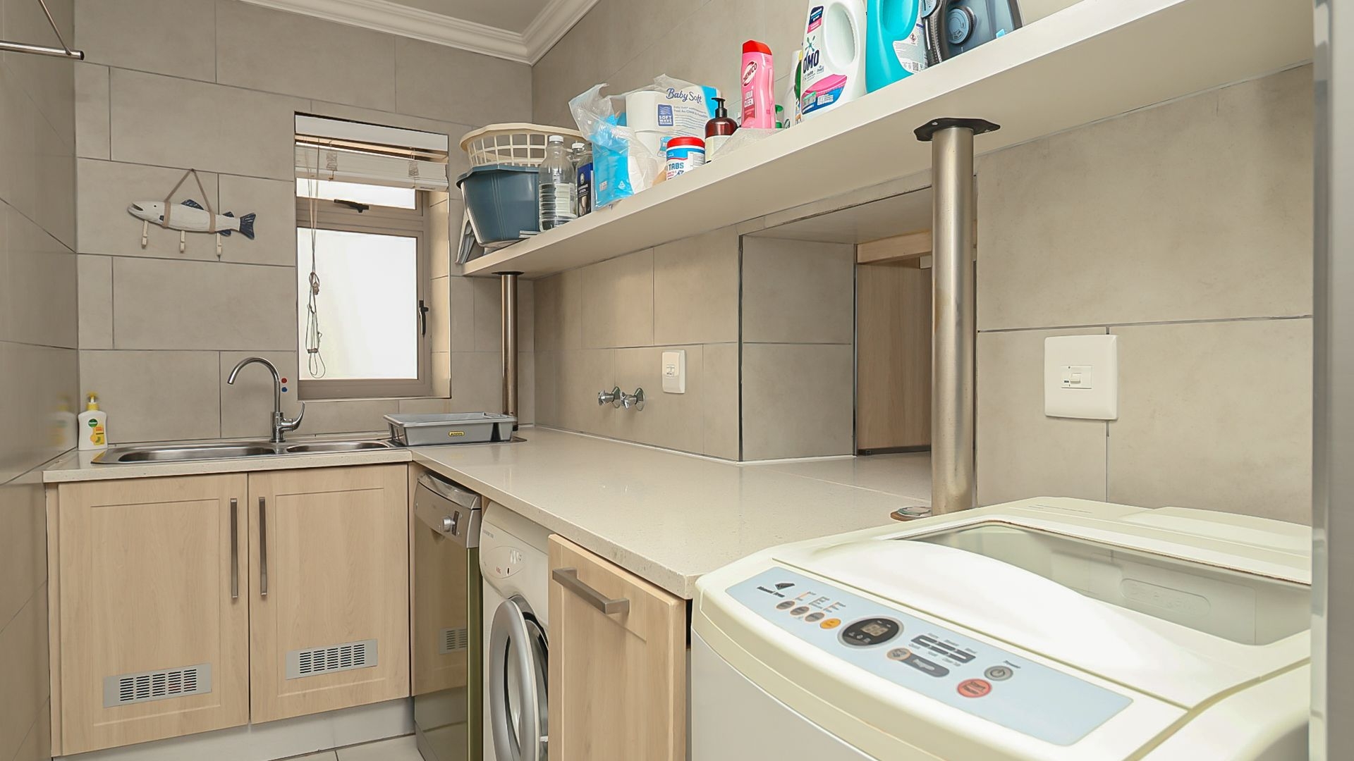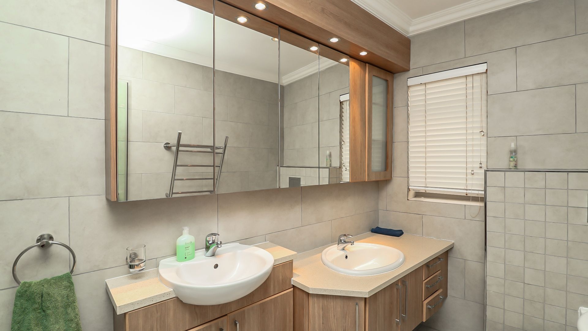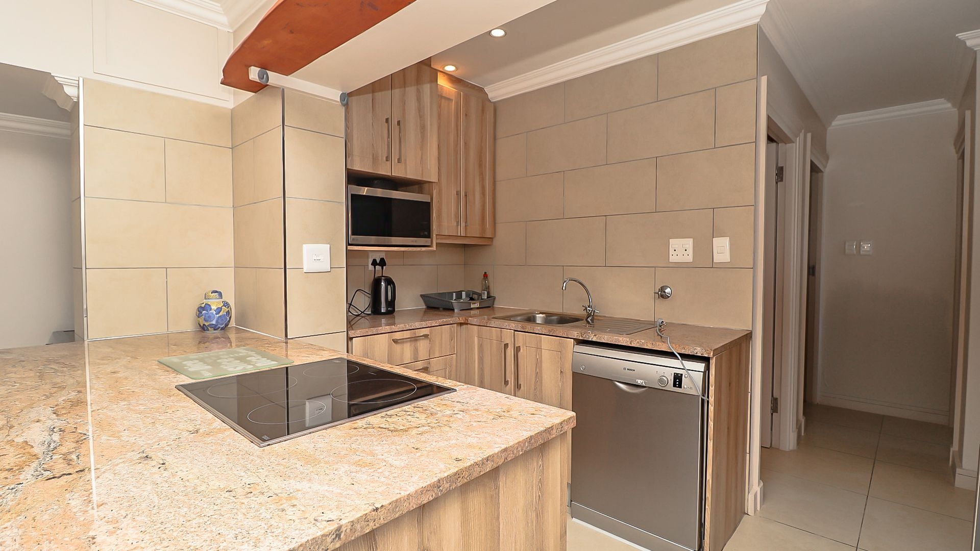 The main level welcomes you with a bright, open-plan living area, seamlessly integrating the kitchen and dining room. The kitchen is equipped with a modern gas stove and is supported by a separate scullery for convenience. Entertainment is a breeze with a dedicated closed braai area for all-weather grilling.