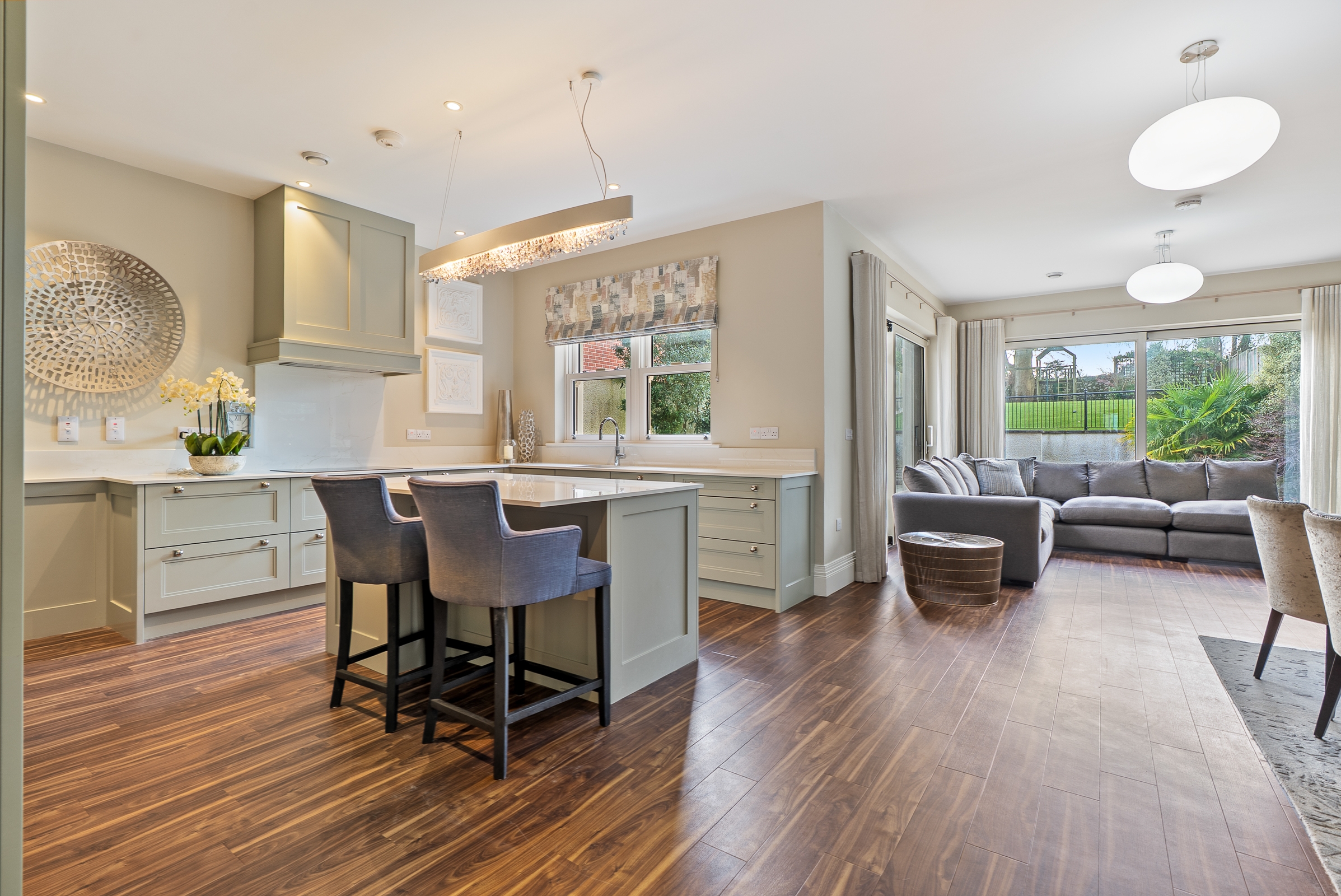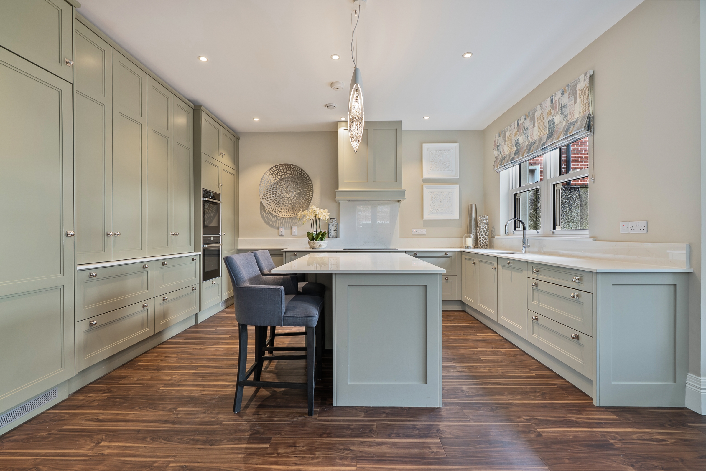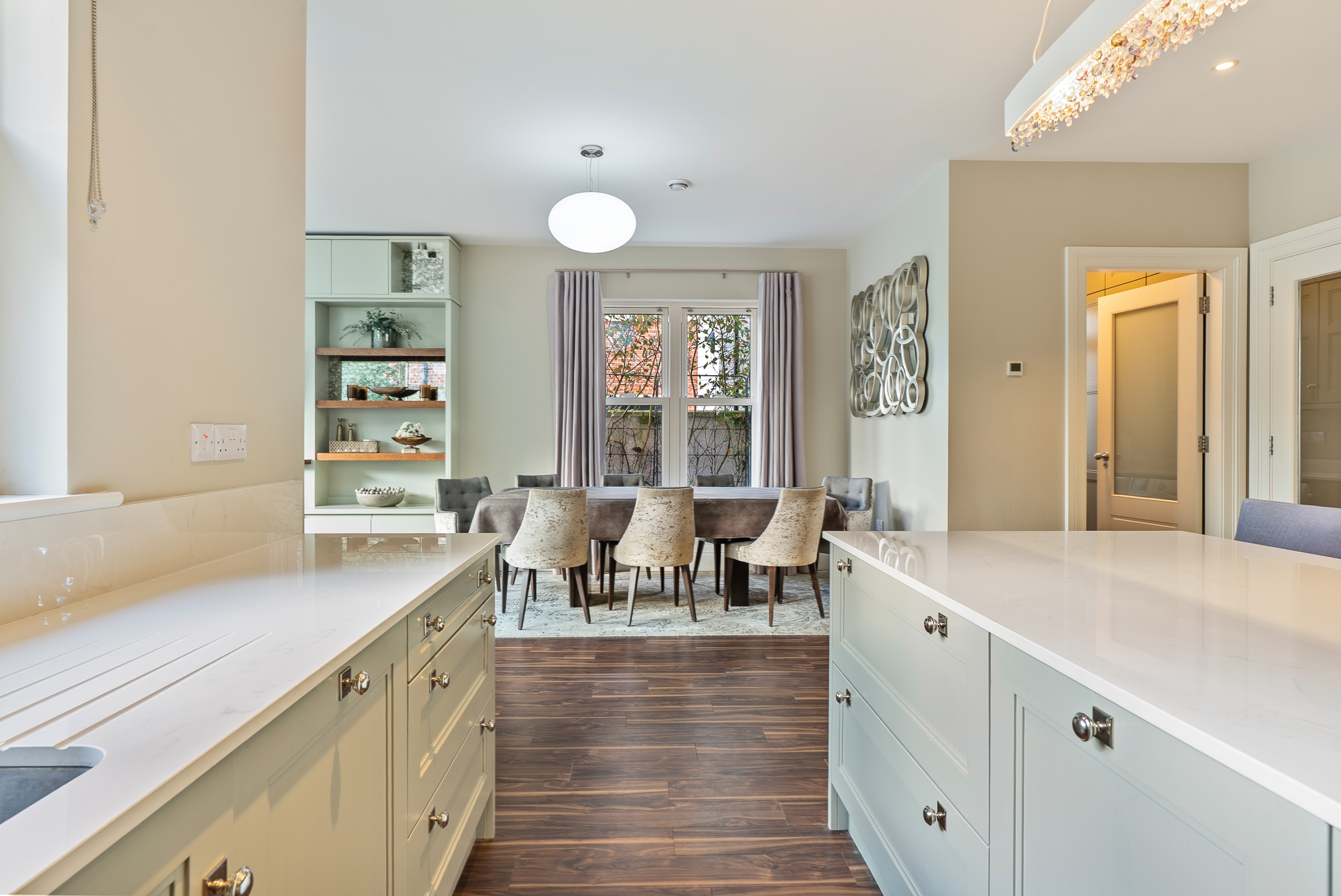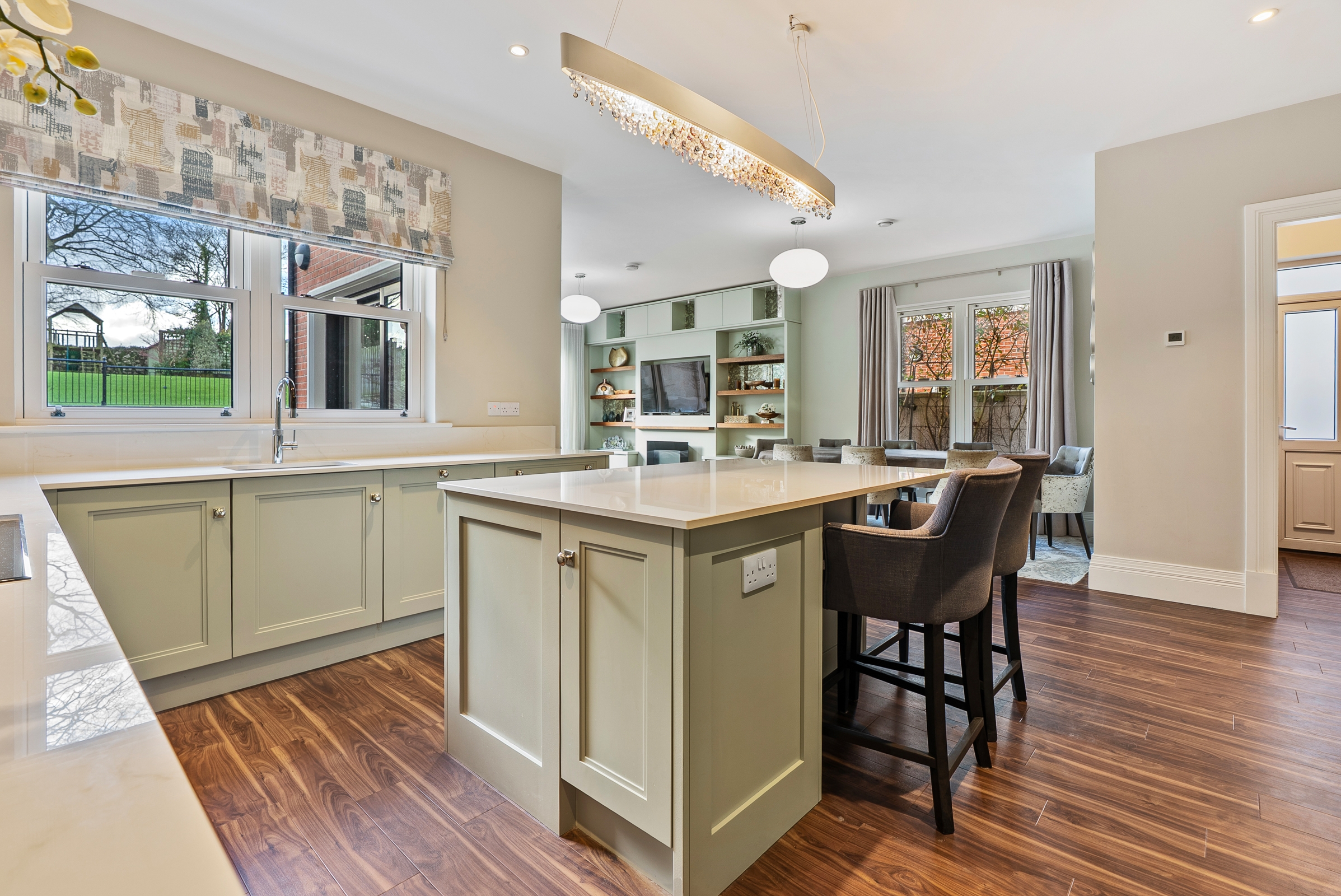 The kitchen has high quality fitted floor to ceiling cabinetry along one wall, incorporating the integrated fridge, the freezer and two electric ovens, with floor level cabinets wrapping round the other two walls, housing the integrated dishwasher and induction hob, which allows for plenty of storage. The extractor is discreetly hidden in an eye level cabinet complimenting the other cabinetry. The extensive worktop counters and splash backs are manufactured from premium Dekton sintered stone. The superb island unit complies of further storage and a seating area, with a feature light fitting overhead. Recessed spot lighting and a window overlooking the back garden, keeps the kitchen bright throughout the day and evening.