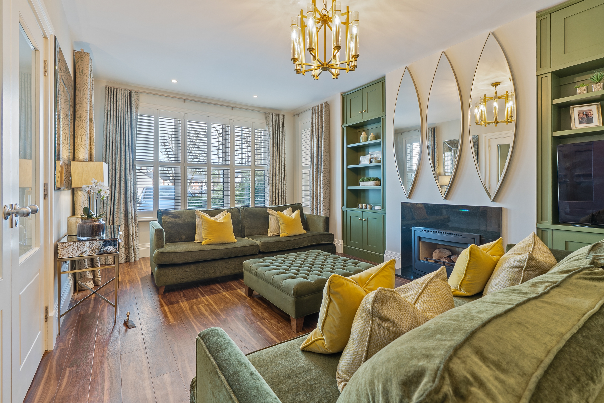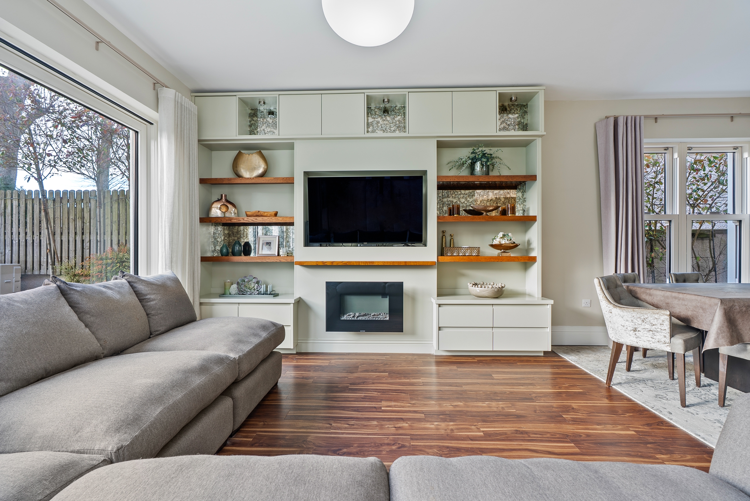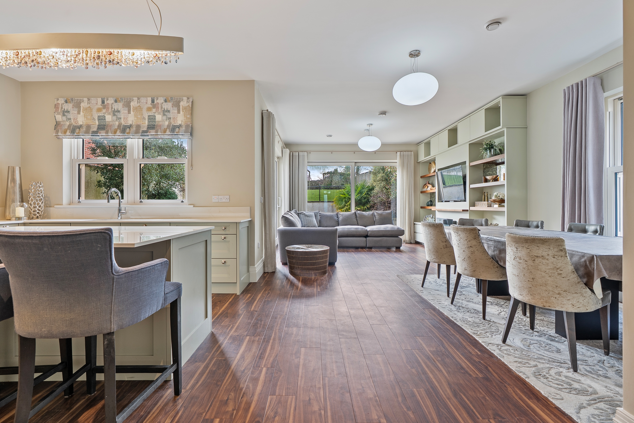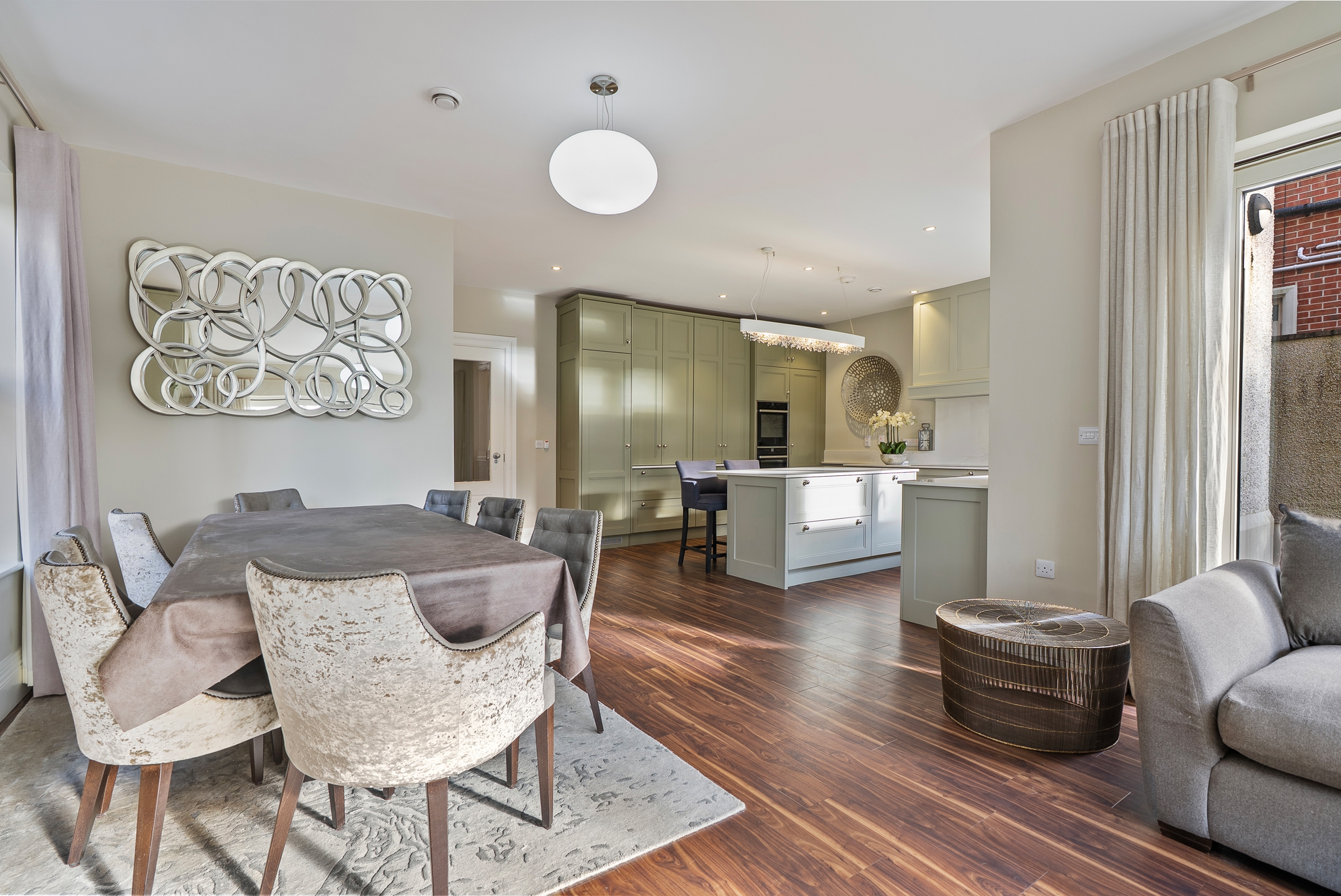 The kitchen has high quality fitted floor to ceiling cabinetry along one wall, incorporating the integrated fridge, the freezer and two electric ovens, with floor level cabinets wrapping round the other two walls, housing the integrated dishwasher and induction hob, which allows for plenty of storage. The extractor is discreetly hidden in an eye level cabinet complimenting the other cabinetry. The extensive worktop counters and splash backs are manufactured from premium Dekton sintered stone. The superb island unit complies of further storage and a seating area, with a feature light fitting overhead. Recessed spot lighting and a window overlooking the back garden, keeps the kitchen bright throughout the day and evening.