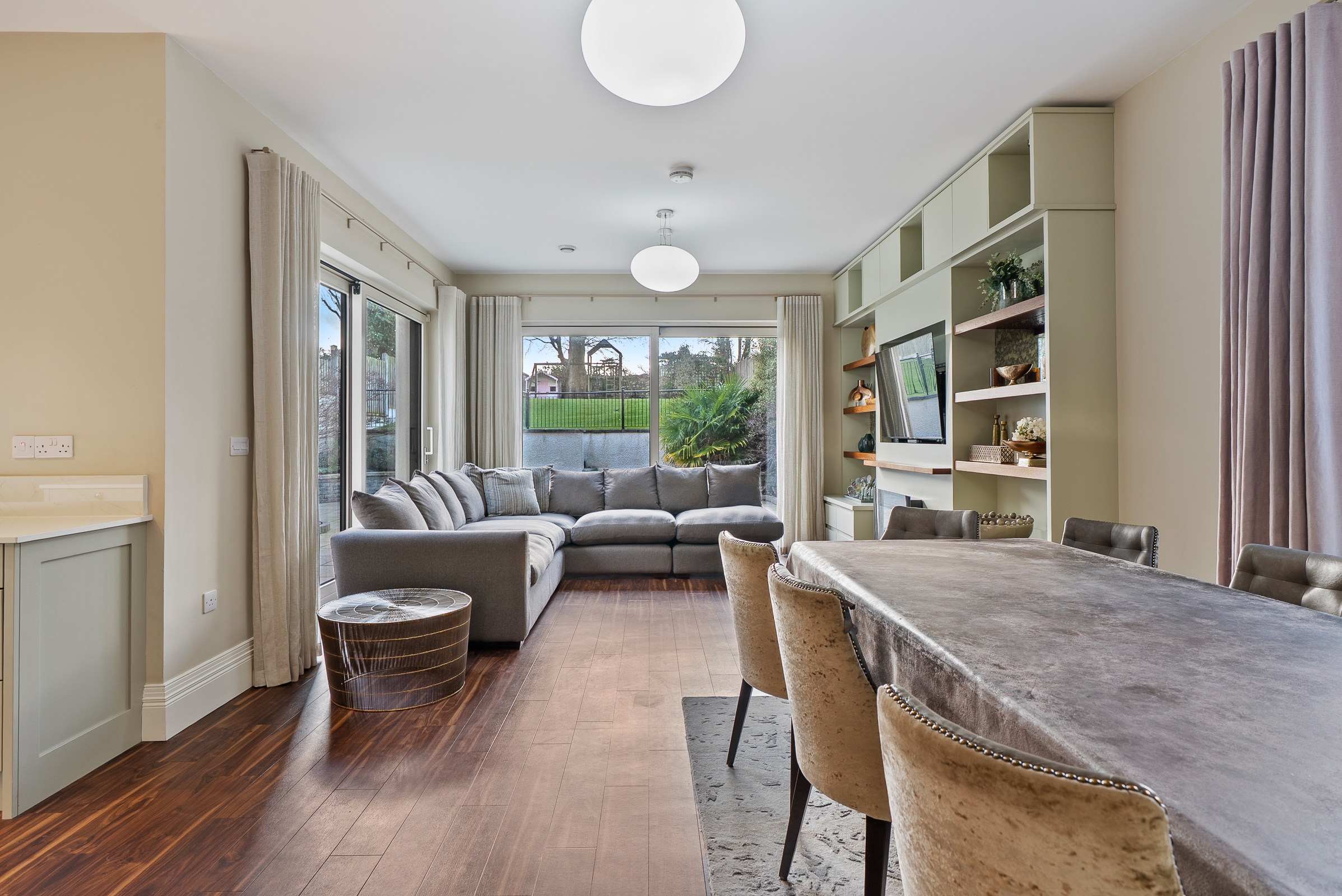 This spacious area has extensive dining space with ample room for a large table and chairs and it leads onto a living area with ample space for a suite of furniture, sliding doors allow access out to the rear patio and onto the garden.