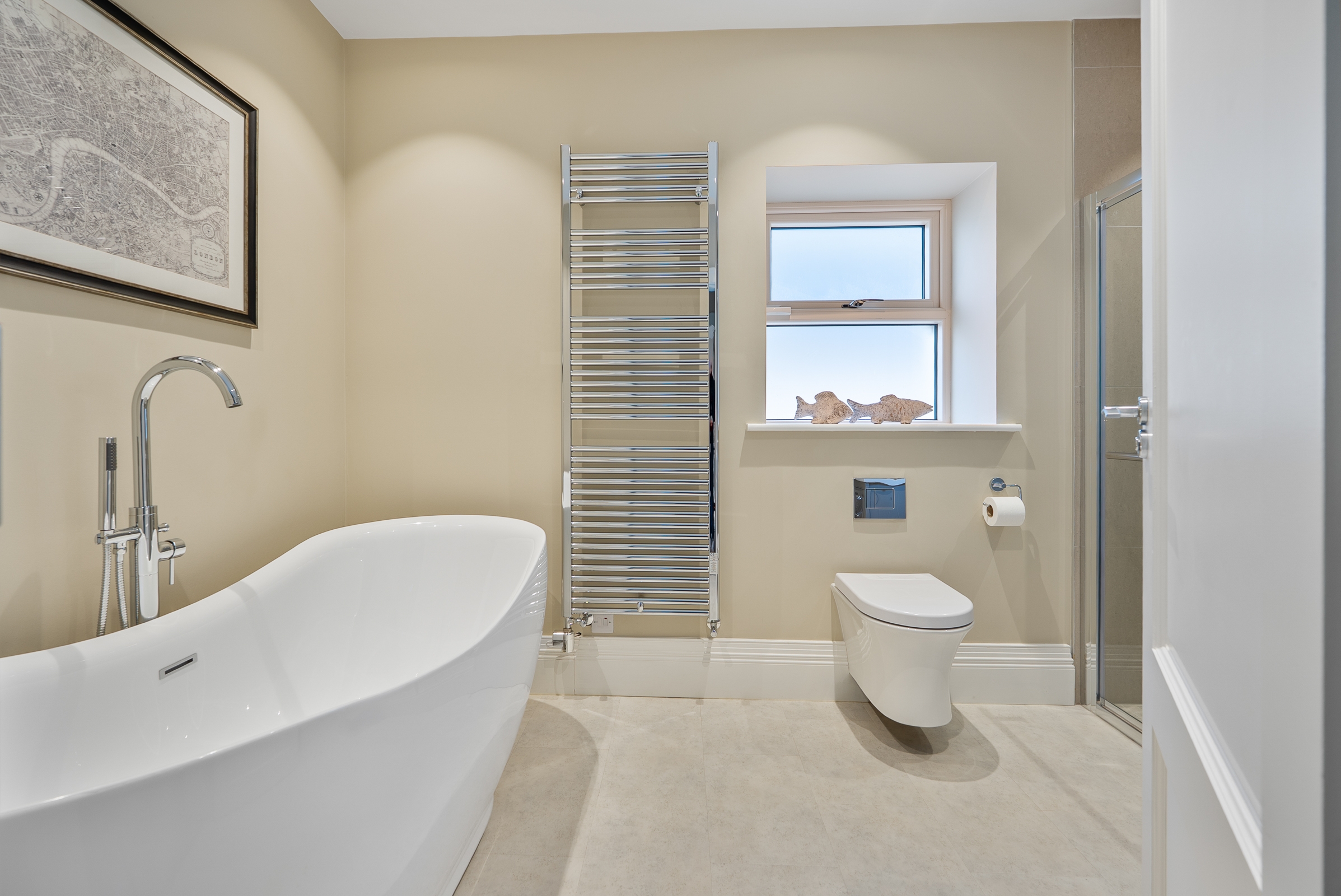 The main family bathroom features a stand alone bathtub and a separate shower cubicle incorporating a mains operated shower, a frosted window to the side of the property, Amtico flooring, heated towel rail, recessed spot lighting, and high quality décor.